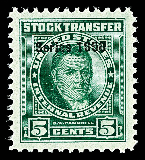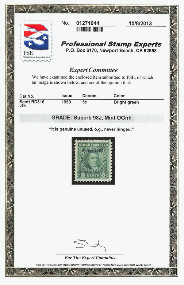 8801 nh RD316 imageStock Transfer, 1950, 5¢ Campbell (Scott RD316), striking, bold impression, the SMQ does not currently price this stamp, o.g., never hinged, Superb, with 2013 P.S.E. certificate graded SUP 98J. (Image) (Image2) (All Images)