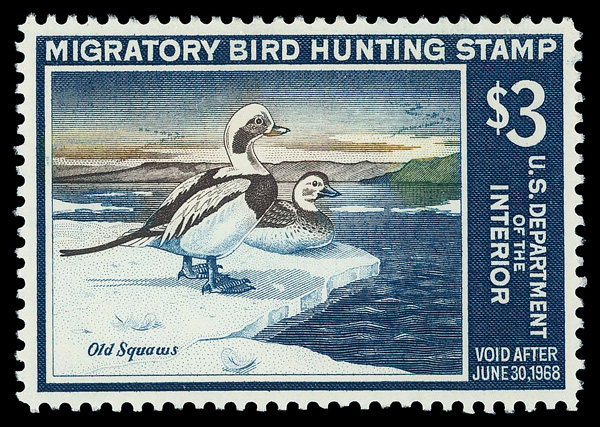 8817 nh RW34 imageFederal Duck Stamp, 1967, $3 Old Squaw Ducks (Scott RW34), o.g., never hinged, Extremely Fine to Superb.