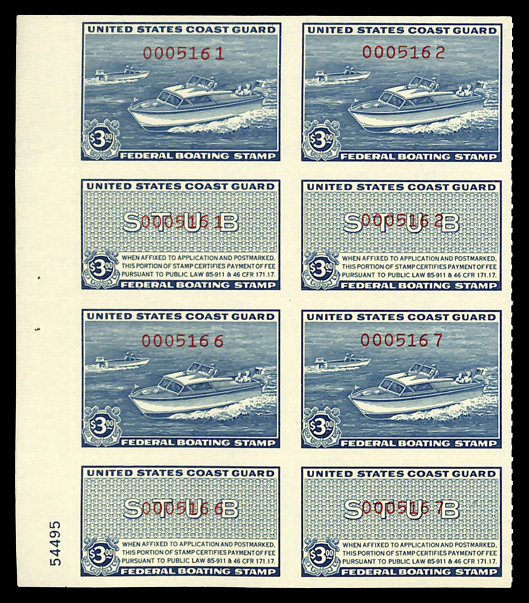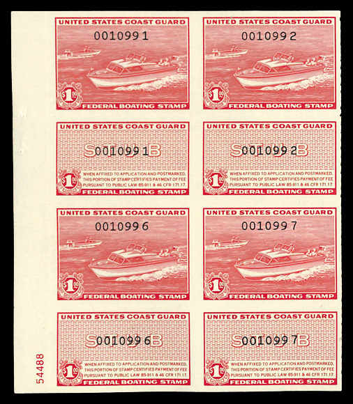 8813 nhbl RVB1-RVB2 imageBoating Stamps, 1960, $1-$3 complete (Scott RVB1-RVB2), set of 2, panes of 4, o.g., never hinged, Extremely Fine.