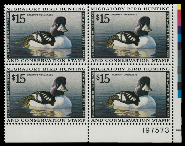 8826 nhbl RW65 imageFederal Duck Stamp, 1998, $15 Goldeneye (Scott RW65), plate block of 4, o.g., never hinged, Extremely Fine.
