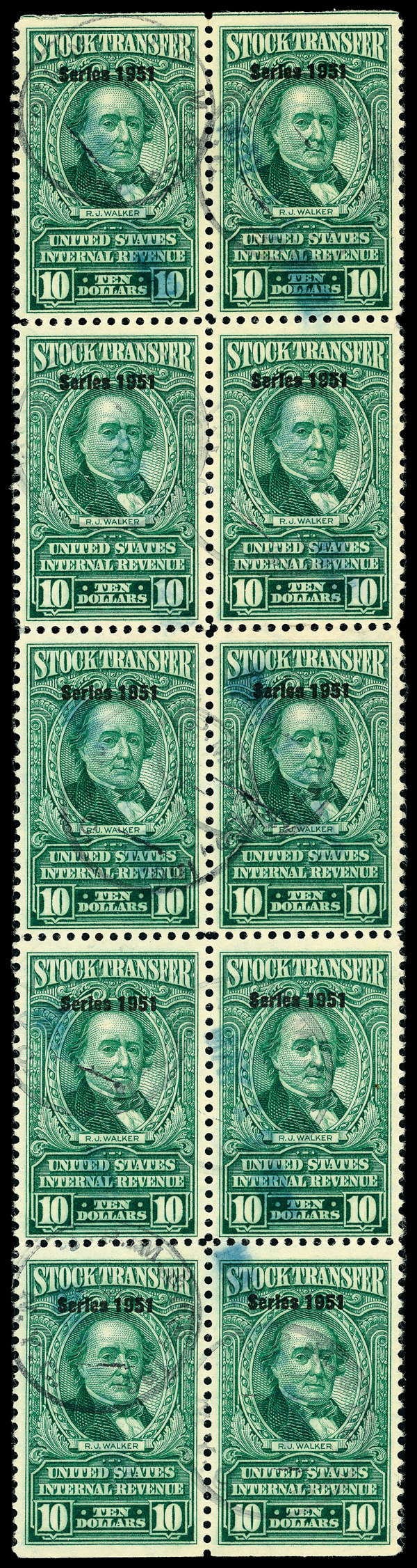 8805 Obl RD354 imageStock Transfer, 1951, $10 Walker (Scott RD354), vertical block of 10, cut cancels, Very Fine.