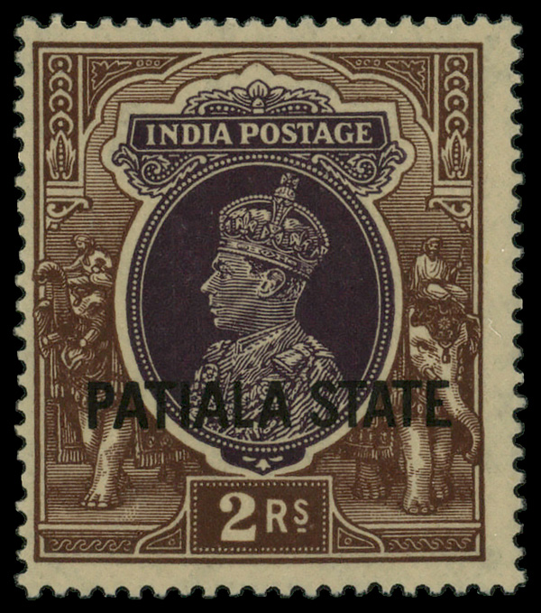 9002 nh 93 image1938, King Geiorge VI 2r dark brown & dark violet overprinted Patiala State (Scott 93), single, o.g., never hinged, Fine to Very Fine.