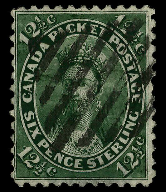 9021 O 18 image1859, Queen Victoria, 12½¢ yellow green (Scott 18); thin, Fine to Very Fine.