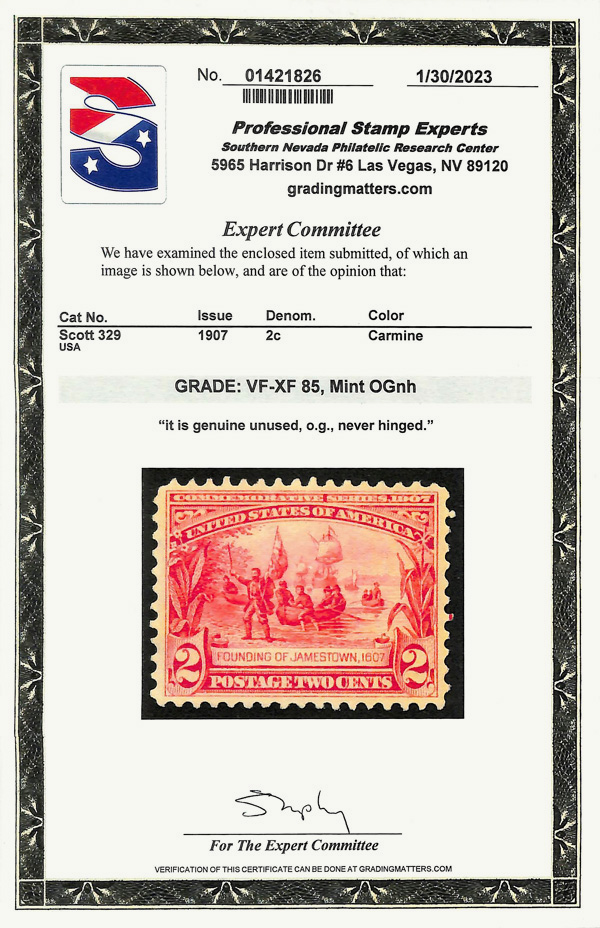 8141 nh 329 image1907, 2¢ Jamestown (Scott 329), o.g., never hinged, Very Fine to Extremely Fine, with 2023 P.S.E. certificate graded VF-XF 85.