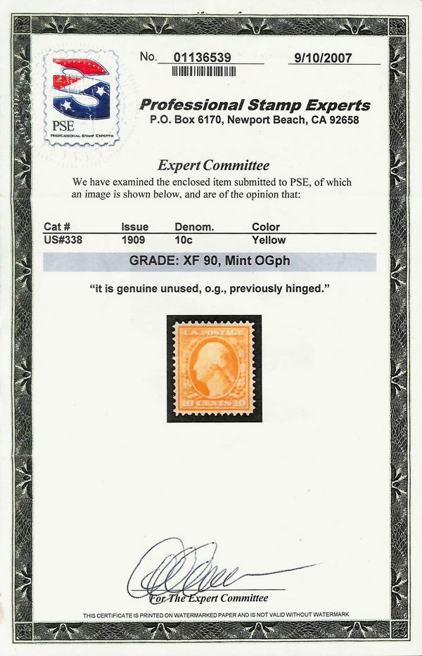 8144 og 338 image1909, 10¢ yellow, D.L. watermark (Scott 338), o.g., lightly hinged, Extremely Fine, with 2007 P.S.E. certificate graded XF 90.
