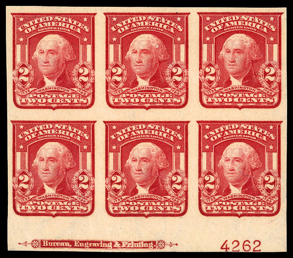 8135 nh/ogbl 320 image1906, 2¢ carmine, type I, imperf. (Scott 320), bottom margin plate block of 6, o.g., never hinged, a couple stamps are very lightly hinged, Very Fine to Extremely Fine.