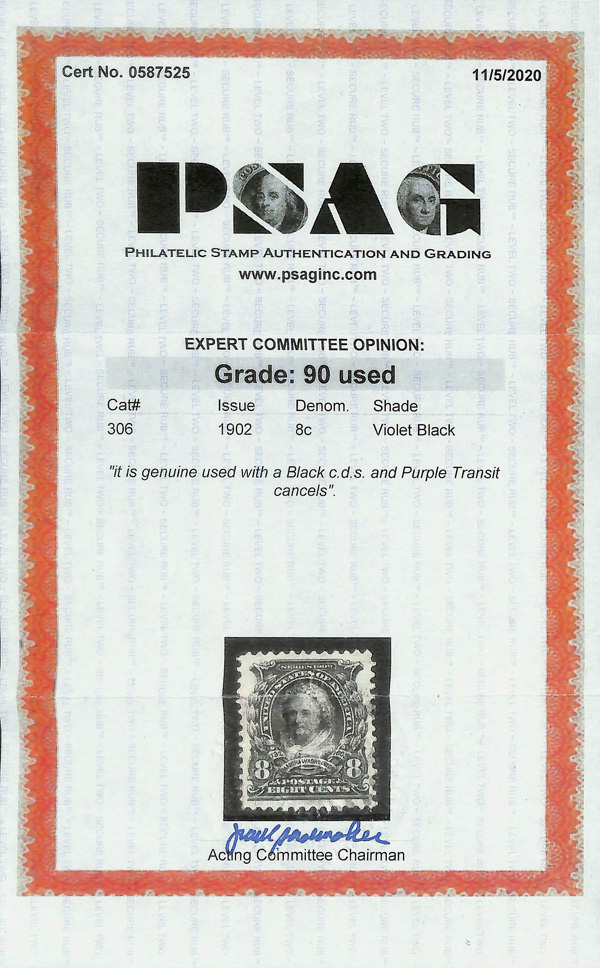 8126 O 306 image1902, 8¢ violet black (Scott 306), black c.d.s. and purple transit cancels, Extremely Fine, with 2020 P.S.A.G. certificate graded XF 90.