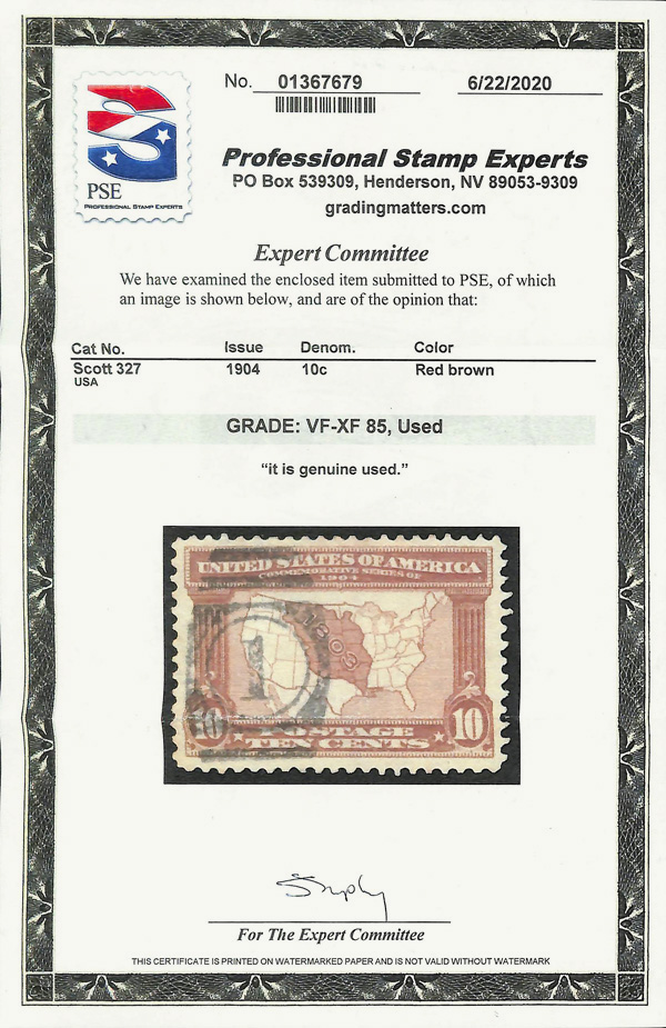8138 O 327 image1904, 10¢ Louisiana Purchase (Scott 327), Very Fine to Extremely Fine, with 2020 P.S.E. certificate graded VF-XF 85.