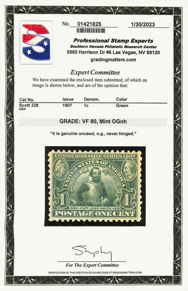 8140 nh 328 image1907, 1¢ Jamestown (Scott 328), o.g., never hinged, Very Fine, with 2023 P.S.E. certificate graded VF 80.