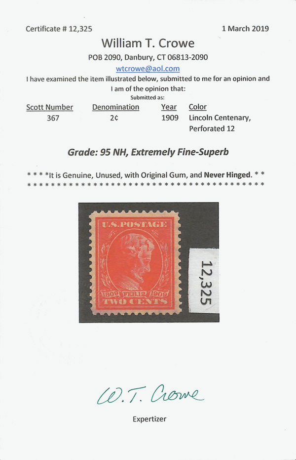 8154 nh 367 image1909, 2¢ Lincoln (Scott 367), near-perfect original freshness, o.g., never hinged, Extremely Fine to Superb, with 2019 Crowe certificate graded XF-SUP 95.
