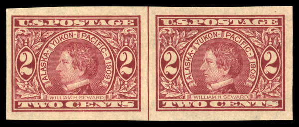 8160 nh 371 image1909, 2¢ Alaska-Yukon, imperf. (Scott 371), horizontal pair with guide line between, o.g., never hinged, Extremely Fine to Superb.
