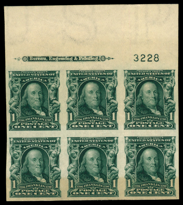 8131 nhbl 314 image1906, 1¢ blue green, imperf. (Scott 314), plate block of 6, o.g., never hinged (minor gum creases), Very Fine.
