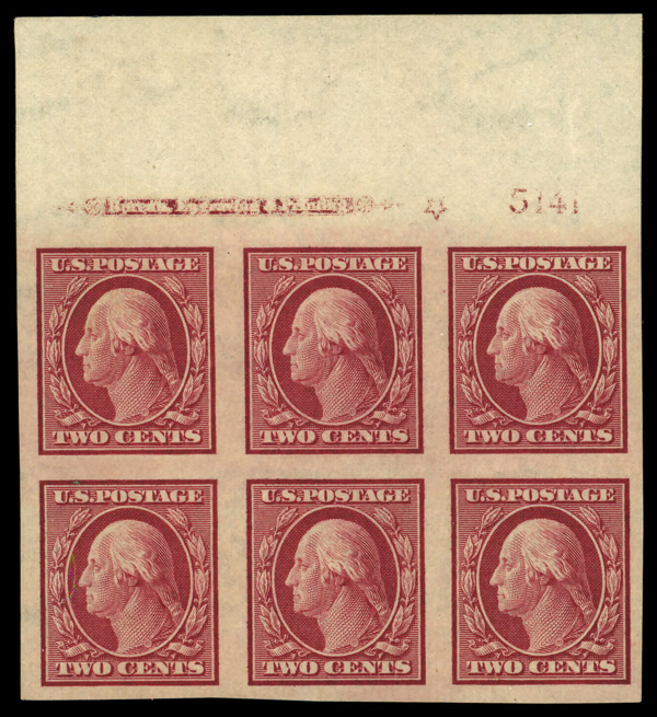 8148 nhbl 344 image1908, 2¢ carmine, D.L. watermark, imperf. (Scott 344), plate block of 6 with star, o.g., never hinged, Very Fine to Extremely Fine.