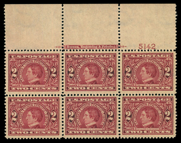 8159 nhbl 370 image1909, 2¢ Alaska-Yukon (Scott 370), plate block of 6, o.g., never hinged, Very Fine to Extremely Fine.