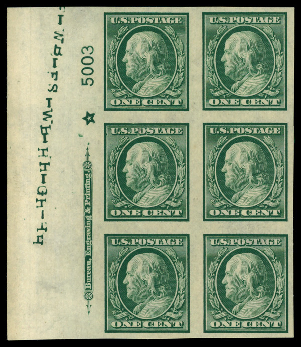8146 nhbl 343 image1908, 1¢ green, D.L. watermark, imperf. (Scott 343), plate block of 6 with star, o.g., never hinged, Very Fine.