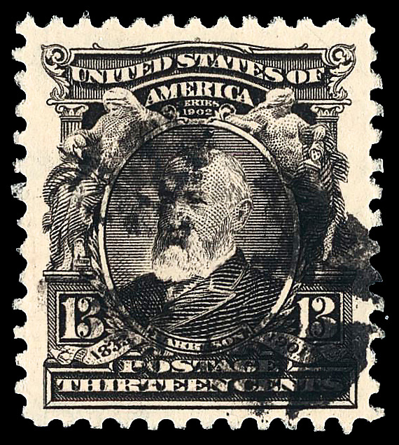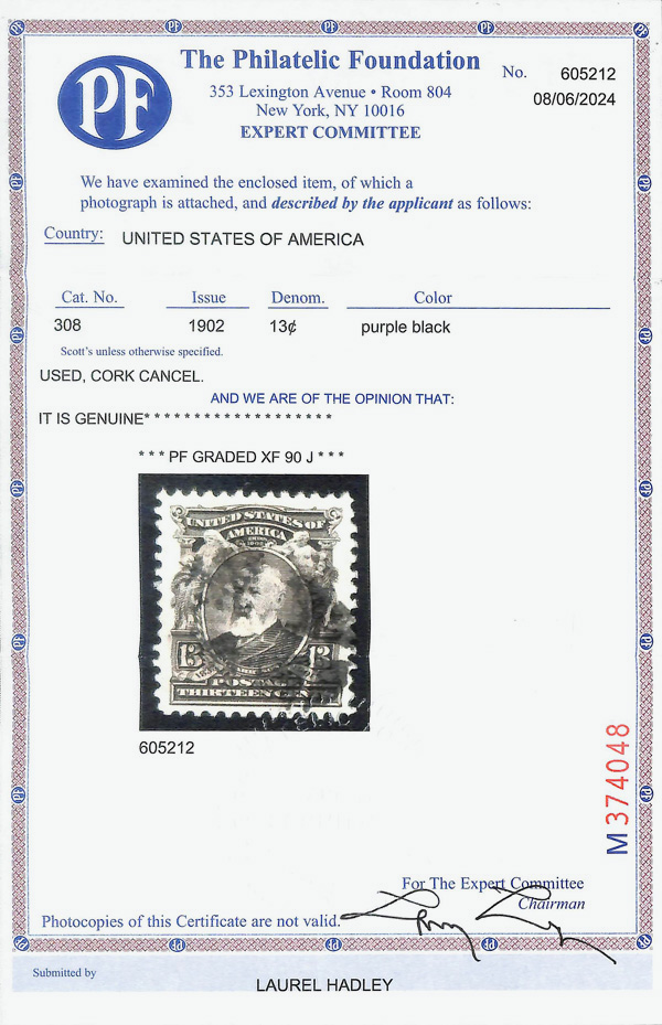 8129 O 308 image1902, 13¢ purple black (Scott 308), Extremely Fine, with 2024 P.F. certificate graded XF 90J.
