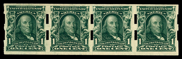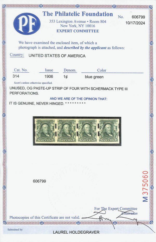 8130 nh 314 image1906, 1¢ blue green, imperf. (Scott 314), Schermack type III perfs paste-up strip of 4, o.g., never hinged, Very Fine, with 2024 P.F. certificate.