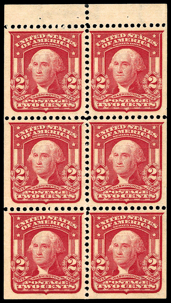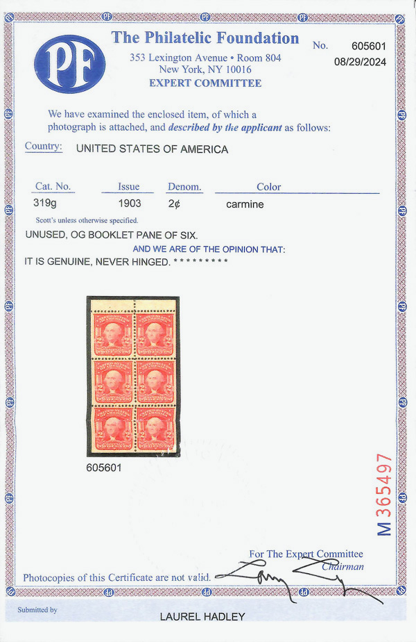 8133 BKnh 319g image1903, 2¢ carmine, type I, booklet pane of 6 (Scott 319g), o.g., never hinged, Extremely Fine, with 2024 P.F. certificate.