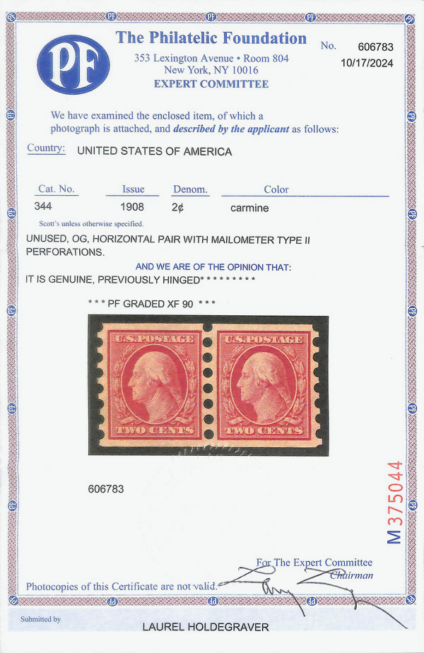 8147 og 344 image1908, 2¢ carmine, D.L. watermark, imperf. (Scott 344), Mailometer type II 3mm pair, o.g., lightly hinged, Extremely Fine, with 2024 P.F. certificate graded XF 90.