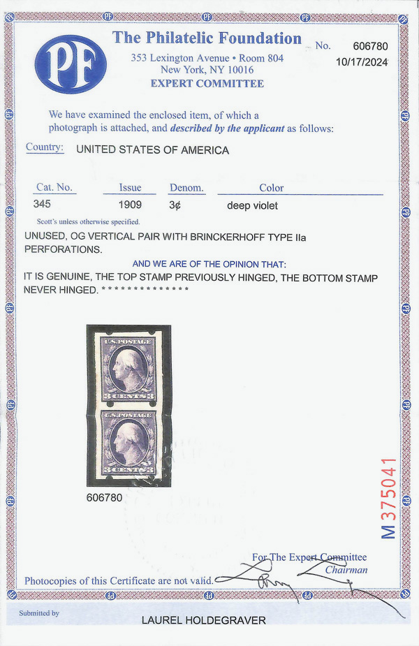 8149 og 345 image1909, 3¢ deep violet, type I, D.L. watermark, imperf. (Scott 345), Brinkerhoff type II pair without knife cut, certificate notes type IIa perfs in error, o.g., hinged, Fine to Very Fine, with 2024 P.F. certificate.