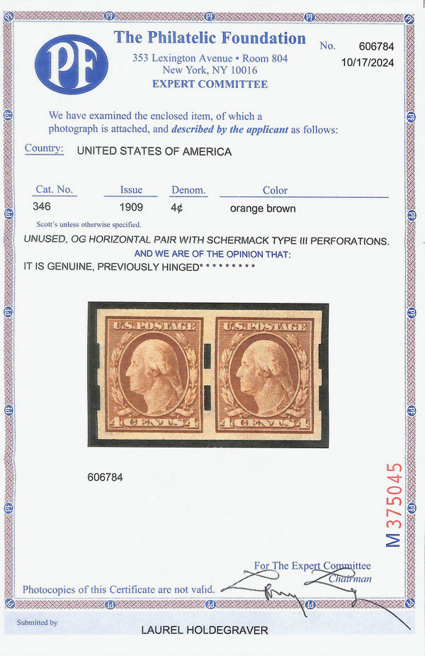 8151 og 346 image1909, 4¢ orange brown, D.L. watermark, imperf. (Scott 346), Schermack type III 2mm pair, o.g., lightly hinged, Extremely Fine, with 2024 P.F. certificate.