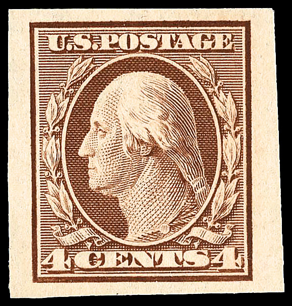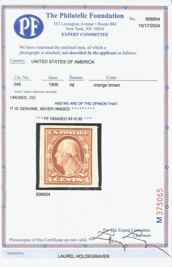 8150 nh 346 image1909, 4¢ orange brown, D.L. watermark, imperf. (Scott 346), o.g., never hinged, Extremely Fine to Superb, with 2024 P.F. certificate graded XF-SUP 95.