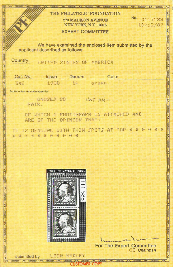 8152 og 348 image1908, 1¢ green, D.L. watermark, coil, perf. 12 horizontally (Scott 348), pair, o.g., heavy hinge remnants; thins, Fine to Very Fine, with 1982 P.F. certificate.