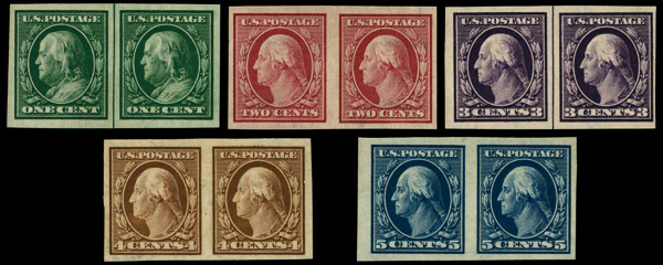 8145 nh 343-347 image1908, Washington-Franklins, D.L. watermark, imperf., 1¢ to 5¢ complete (Scott 343-347), pairs (1¢ & 3¢ with vertical guide lines), o.g., never hinged, Very Fine.