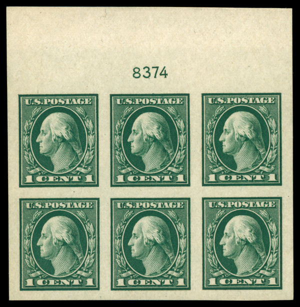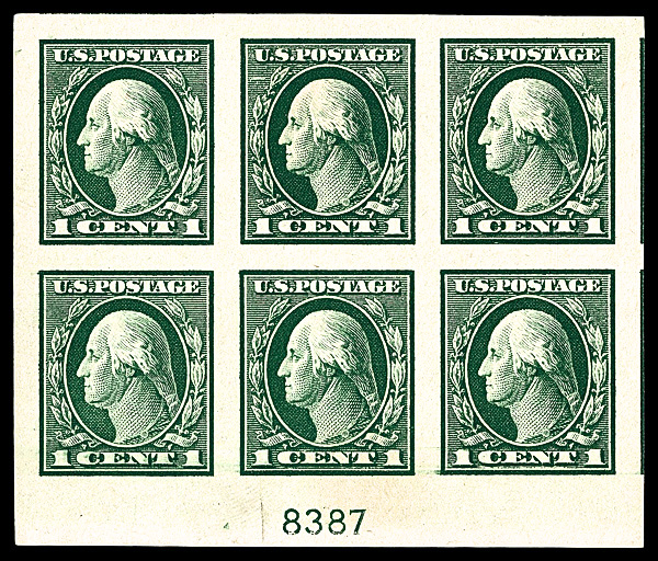 8221 nhbl 481 image1916, 1¢ green, unwatermarked, imperf. (Scott 481), plate block of 6, o.g., never hinged, Superb.