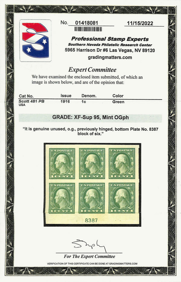 8222 ogbl 481 image1916, 1¢ green, unwatermarked, imperf. (Scott 481), bottom margin plate block of 6, o.g., previously hinged, Extremely Fine to Superb, with 2022 P.S.E. certificate graded XF-SUP 95.