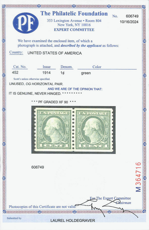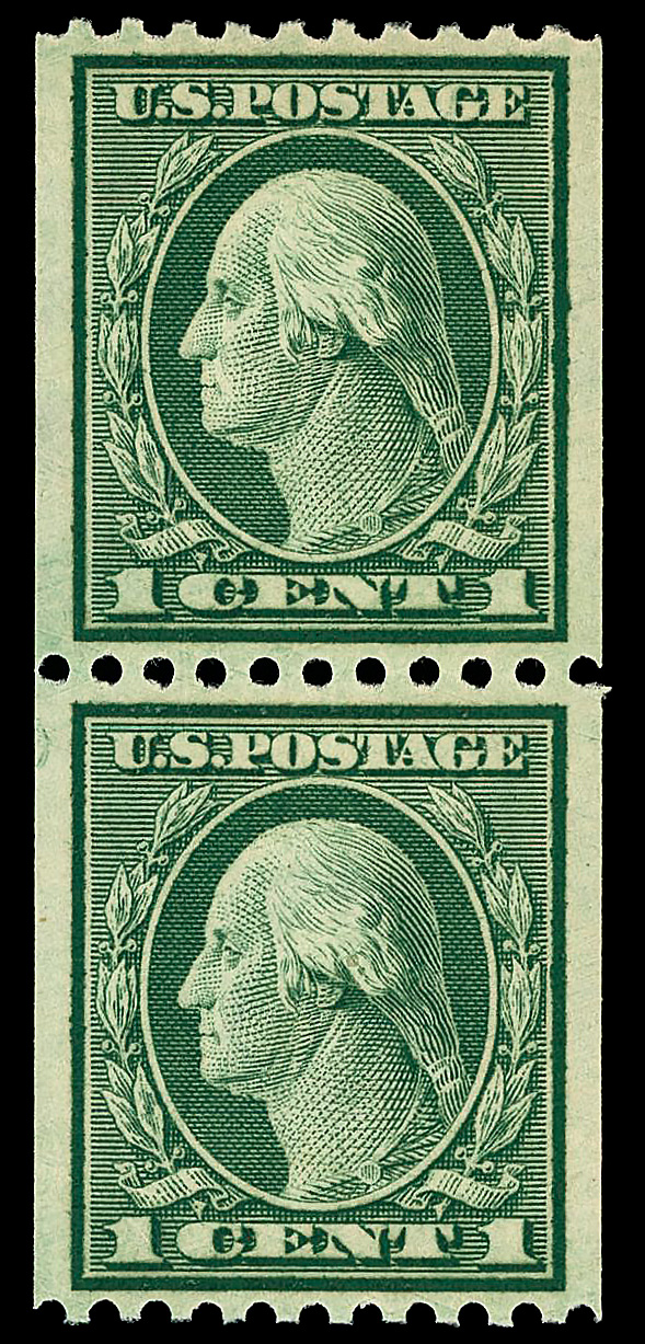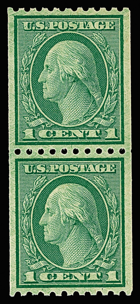 8210 nh 452 image1914, 1¢ green, S.L. watermark, rotary press coil, perf. 10 vertically (Scott 452), pair, o.g., never hinged, Extremely Fine, with 2024 P.F. certificate graded XF 90.