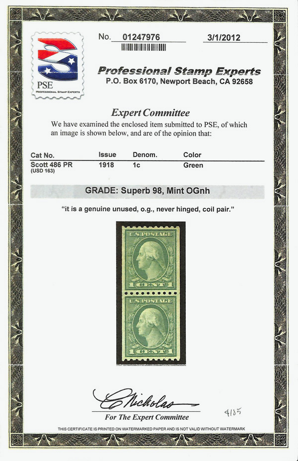 8225 nh 486 image1918, 1¢ green, unwatermarked, rotary press coil, perf. 10 horizontally (Scott 486), pair, balanced margins and glowing color, o.g., never hinged, Superb, with 2012 P.S.E. certificate graded SUP 98.
