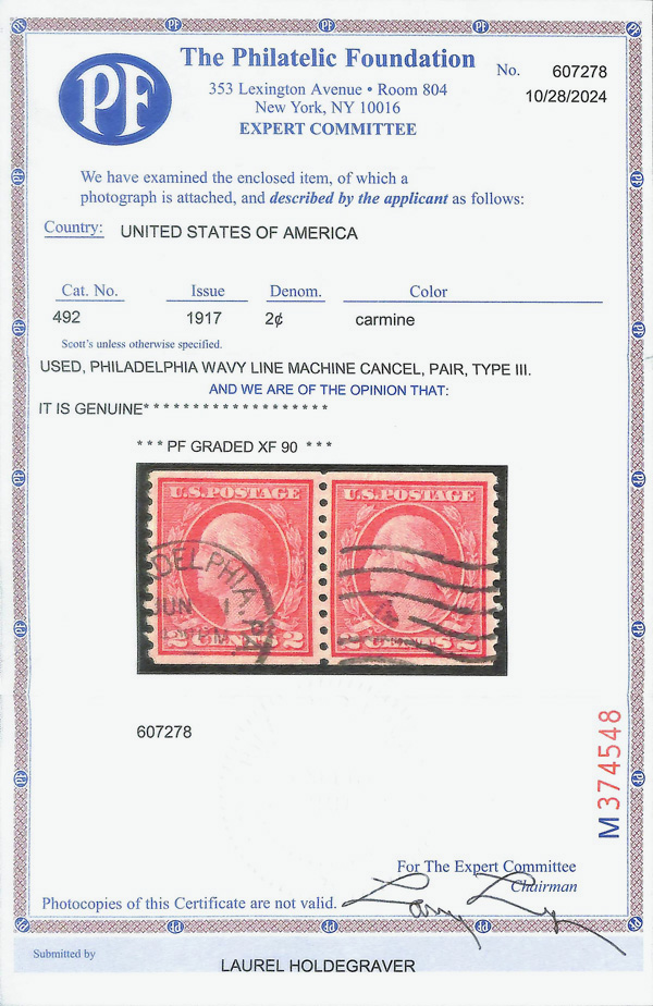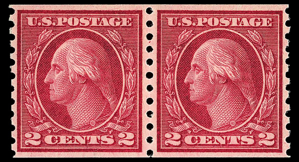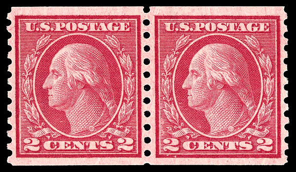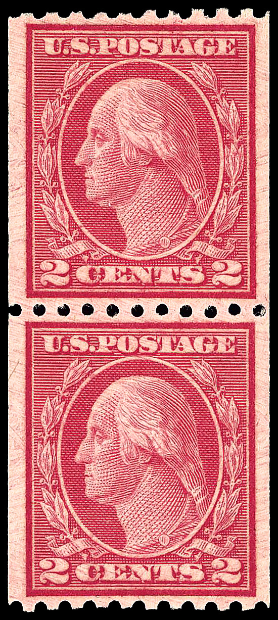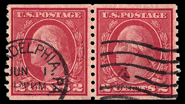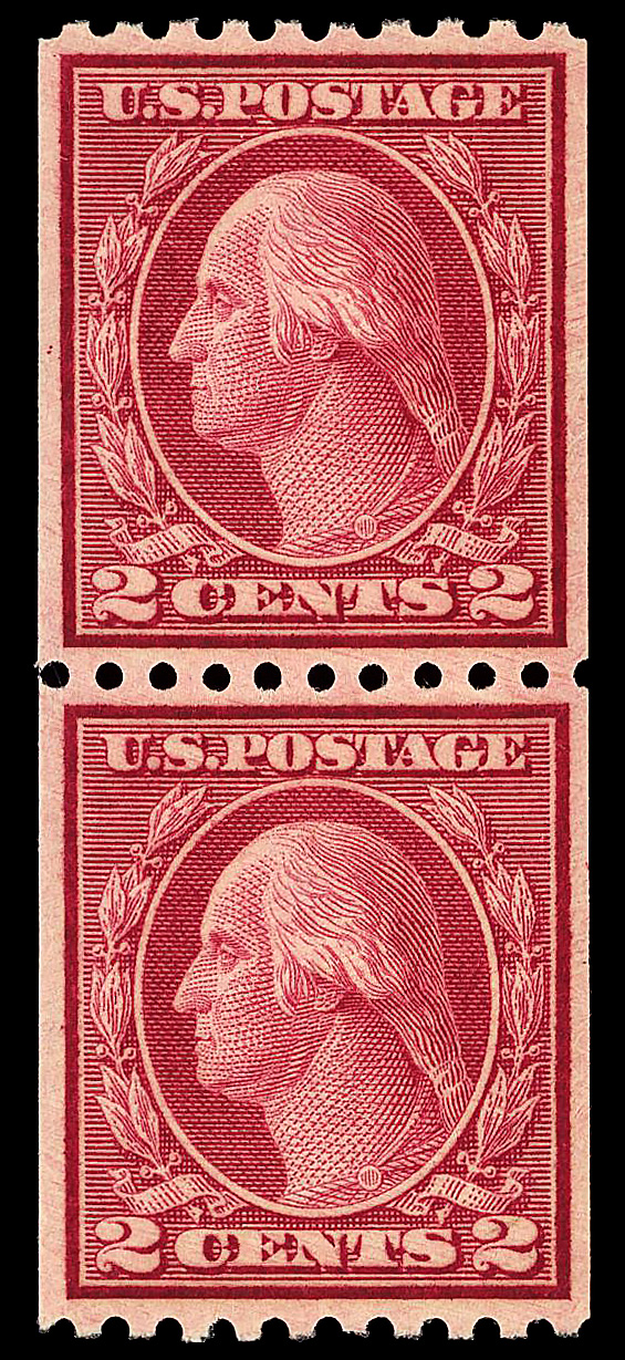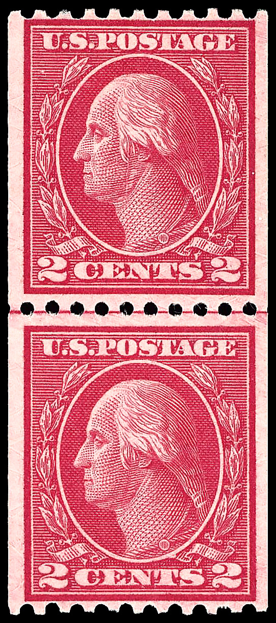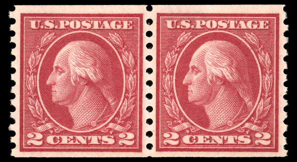 8232 O 492 image1916, 2¢ carmine, type III, unwatermarked, rotary press coil, perf. 10 vertically (Scott 492), pair, Extremely Fine, with 2024 P.F. certificate graded XF 90.