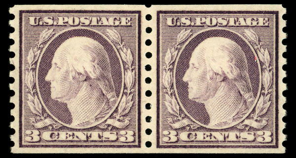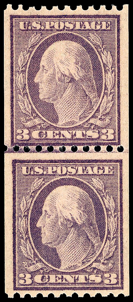 8234 nh 493 image1917, 3¢ violet, type I, unwatermarked, rotary press coil, perf. 10 vertically (Scott 493), pair, o.g., never hinged, Extremely Fine.
