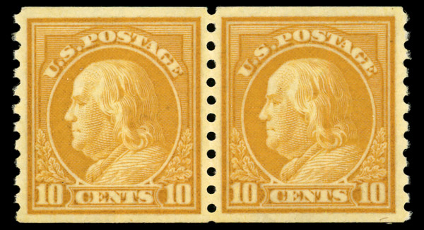 8240 nh 497 image1922, 10¢ orange yellow, unwatermarked, rotary press coil, perf. 10 vertically (Scott 497), pair, o.g., never hinged, Very Fine to Extremely Fine.