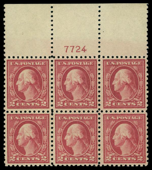 8216 nhbl 463 image1916, 2¢ carmine, type I, unwatermarked, perf. 10 (Scott 463), plate block of 6, o.g., never hinged, Very Fine.