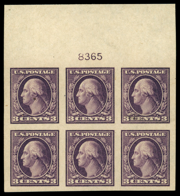 8224 nhbl 484 image1916, 3¢ violet, type II, unwatermarked, imperf. (Scott 484), plate block of 6, o.g., never hinged, Superb.