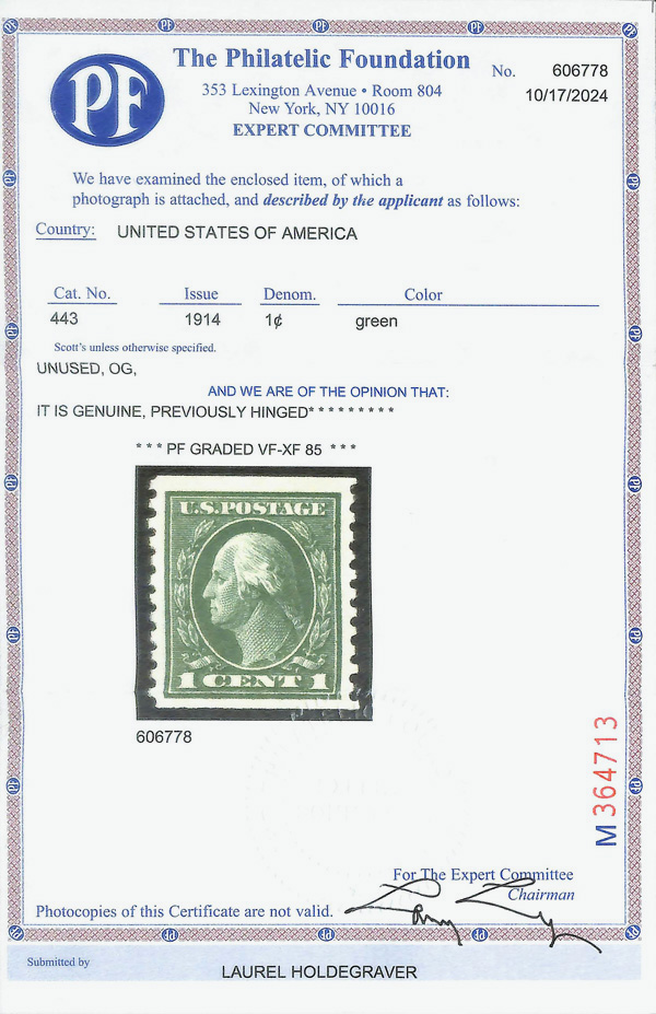8201 og 443 image1914, 1¢ green, S.L. watermark, flat plate coil, perf. 10 vertically (Scott 443), o.g., lightly hinged, Very Fine to Extremely Fine, with 2024 P.F. certificate graded VF-XF 85.