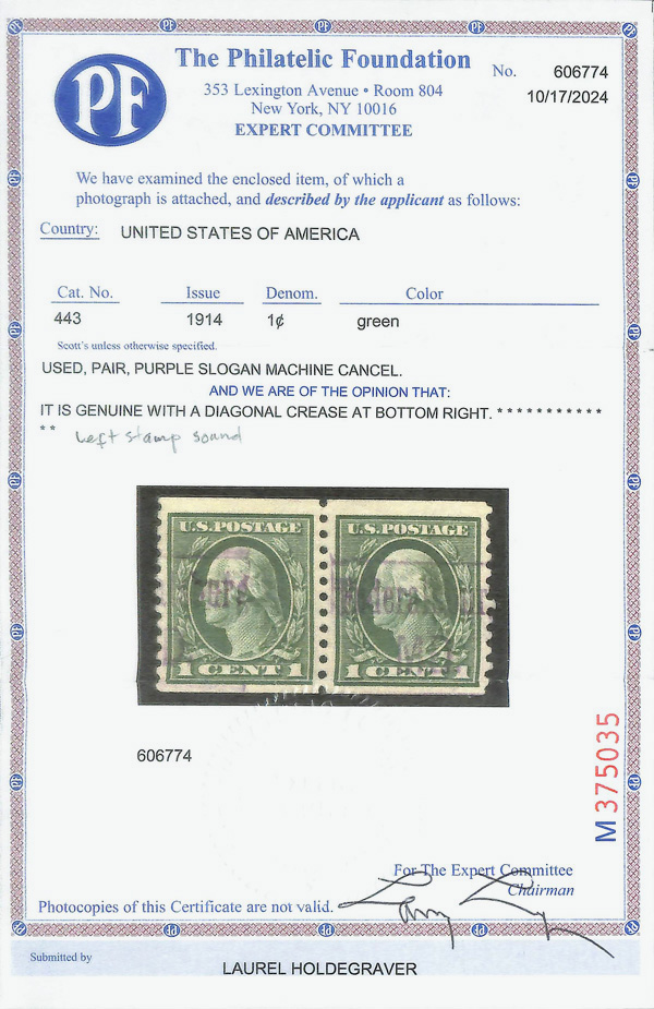 8202 O 443 image1914, 1¢ green, S.L. watermark, flat plate coil, perf. 10 vertically (Scott 443), purple cancel; small crease at LR, Very Fine, with 2024 P.F. certificate.