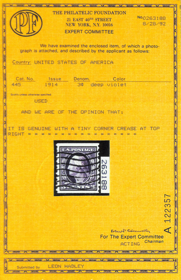 8204 O 445 image1914, 3¢ violet, type I, S.L. watermark, flat plate coil, perf. 10 vertically (Scott 445); faint corner crease UR, Very Fine to Extremely Fine, with 1992 P.F. certificate.