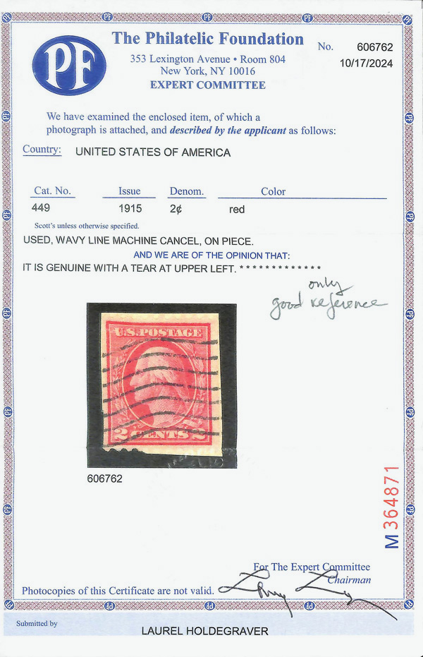 8207 O 449 image1915, 2¢ red, type I, S.L. watermark, rotary press coil, perf. 10 horizontally (Scott 449); tear UL, Very Fine, with 2024 P.F. certificate.