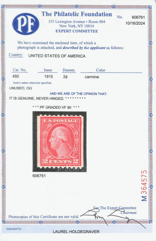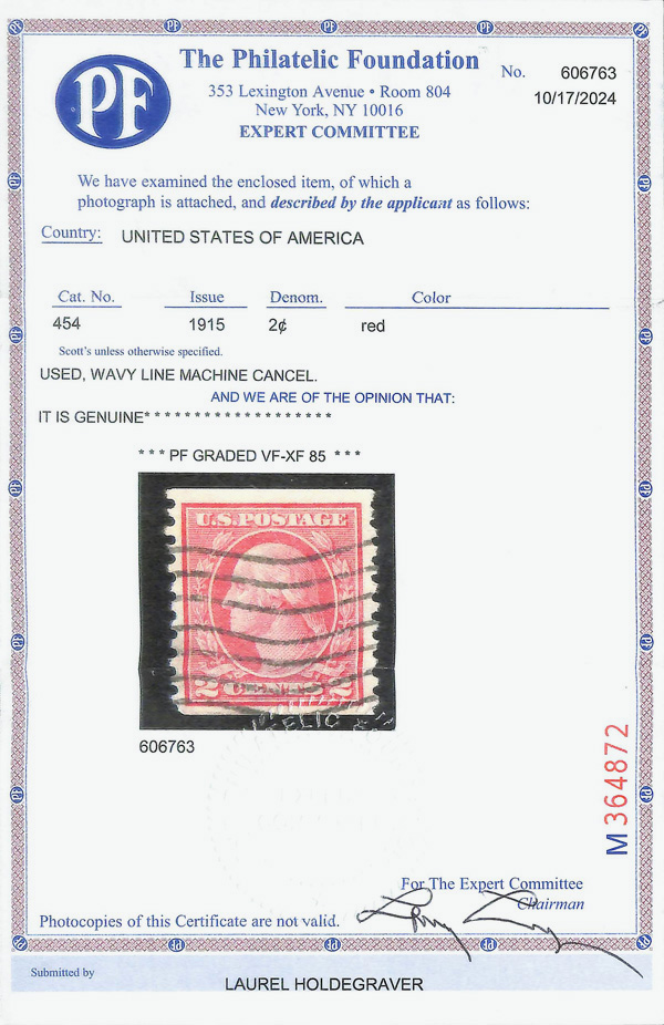 8212 O 454 image1915, 2¢ red, type II, S.L. watermark, rotary press coil, perf. 10 vertically (Scott 454), Very Fine to Extremely Fine, with 2024 P.F. certificate graded VF-XF 85.