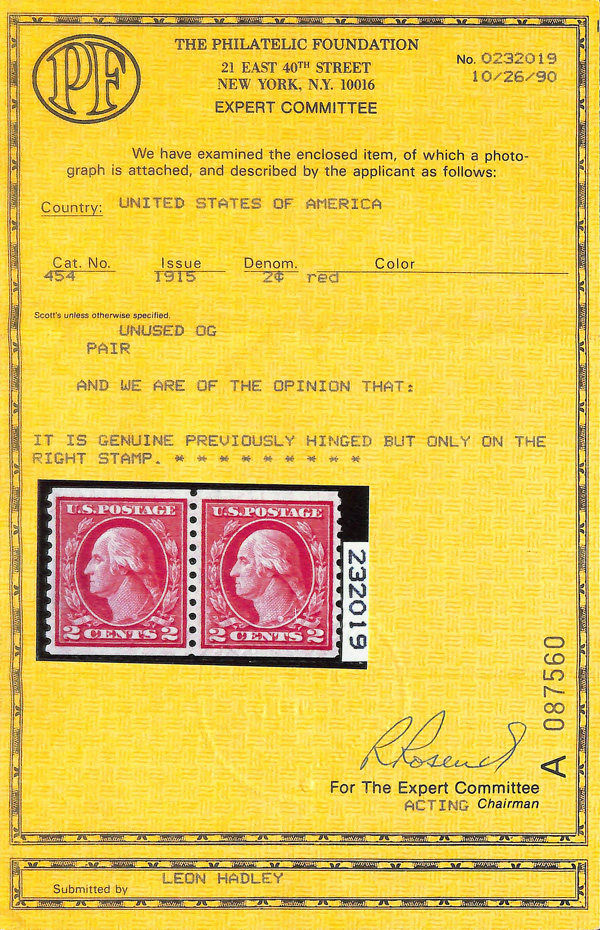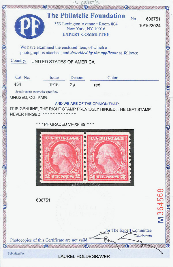 8211 og 454 image1915, 2¢ red, type II, S.L. watermark, rotary press coil, perf. 10 vertically (Scott 454), pair, o.g., very lightly hinged, Very Fine to Extremely Fine, with 2024 P.F. certificate graded VF-XF 85 & 1990 P.F. certificate.