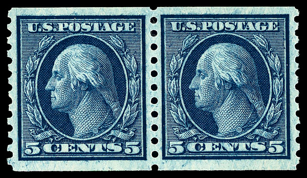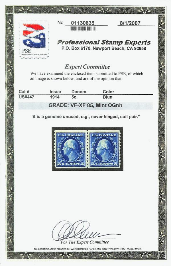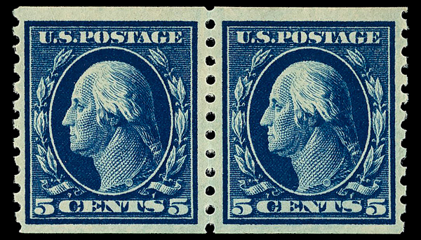 8205 nh 447 image1914, 5¢ blue, S.L. watermark, flat plate coil, perf. 10 vertically (Scott 447), pair, o.g., never hinged, Very Fine to Extremely Fine, with 2007 P.S.E. certificate graded VF-XF 85.