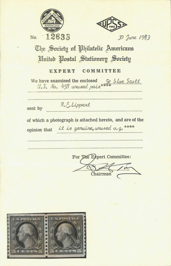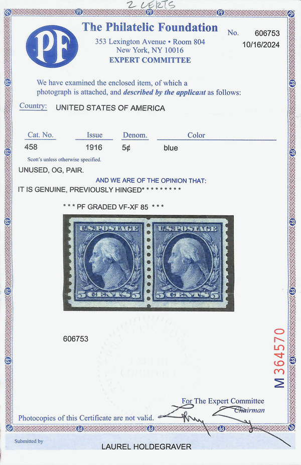 8215 og 458 image1916, 5¢ blue, S.L. watermark, rotary press coil, perf. 10 vertically (Scott 458), pair, o.g., lightly hinged, Very Fine to Extremely Fine, with 2024 P.F. certificate graded VF-XF 85 & 1983 S.P.A. certificate.