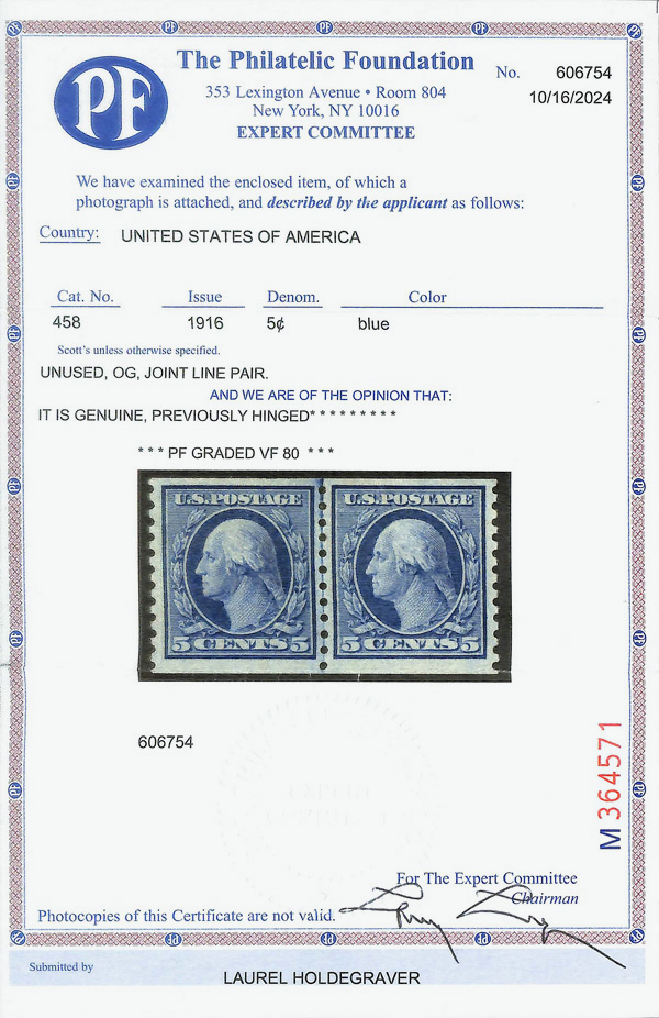 8214 og 458 image1916, 5¢ blue, S.L. watermark, rotary press coil, perf. 10 vertically (Scott 458), joint line pair, o.g., lightly hinged, Very Fine, with 2024 P.F. certificate graded VF 80.