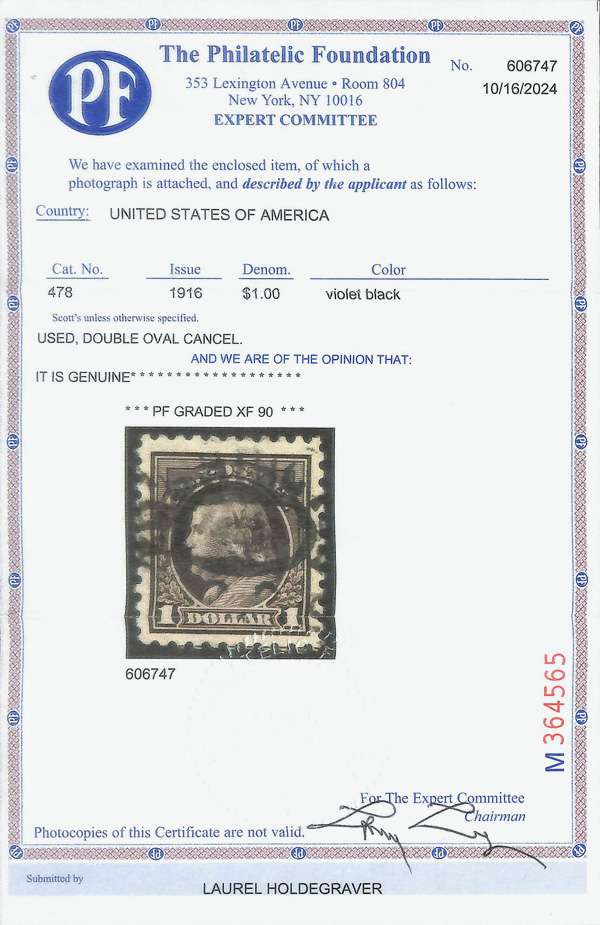 8219 O 478 image1916, $1 violet black, unwatermarked, perf. 10 (Scott 478), Extremely Fine, with 2024 P.F. certificate graded XF 90.