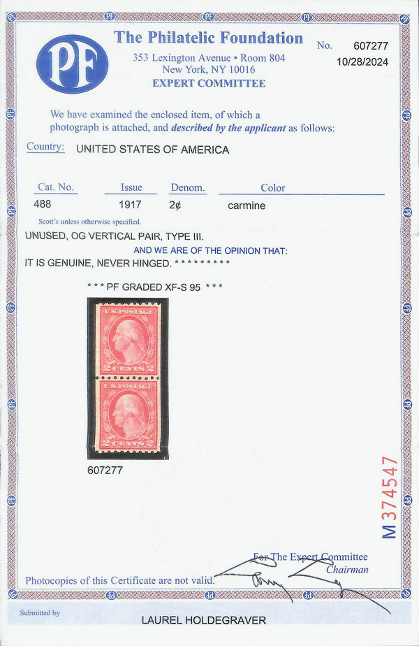 8233 O 492 image1916, 2¢ carmine, type III, unwatermarked, rotary press coil, perf. 10 vertically (Scott 492), identified as #488 in error but graded accurately, Very Fine to Extremely Fine, with 2024 P.F. certificate graded VF-XF 85.