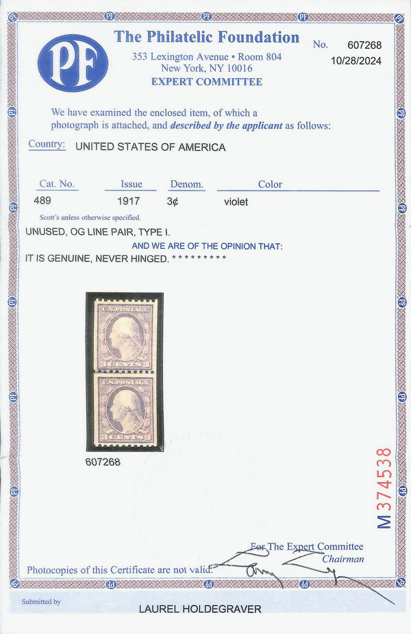 8229 nh 489 image1917, 3¢ violet, type I, unwatermarked, rotary press coil, perf. 10 horizontally (Scott 489), joint line pair, o.g., never hinged, Fine to Very Fine, with 2024 P.F. certificate.