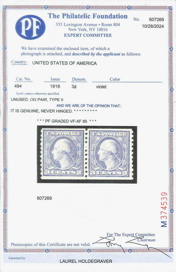 8235 nh 494 image1918, 3¢ violet, type II, unwatermarked, rotary press coil, perf. 10 vertically (Scott 494), pair, o.g., never hinged, Very Fine to Extremely Fine, with 2024 P.F. certificate graded VF-XF 85.
